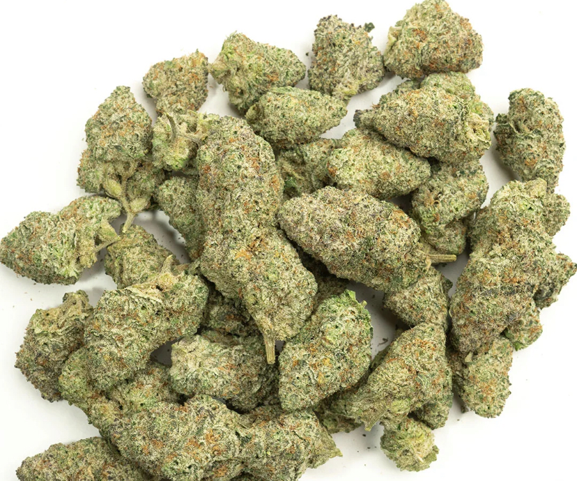 Candy Runtz is an evenly balanced hybrid strain (50% indica/50% sativa) created through crossing the iconic Zkittlez X Gelato strains. This gorgeous combination creates the perfect tasty child strain with an amazingly intoxicating flavor and mellow yet lifted effects that take on both mind and body. The flavor of Candy Runtz is exactly what you’d expect given its name, with hints of sweet fruity caramel candies accented by sour citrus and juicy, ripe berries. The aroma is just as delicious, with a bouquet of fresh fruits, sour citrus and creamy, caramel candies. The Candy Runtz high will settle in with a mellow onset, slipping into both mind and body with a deep sense of relaxation that envelops your entire being with a sense of calm. As you settle down into this happy place, a lifted effect will creep into your mind, filling you with a heady euphoria that puts a big smile on your face. As your mind lifts higher and higher, your body will settle down into the couch and leave you feeling a bit locked down. Combined with its insanely high 19-38% average THC level, these effects give Candy Runtz an edge in treating chronic stress, chronic pain, chronic fatigue, insomnia and depression or mood swings. This bud has fluffy, diamond-shaped forest green nugs with super thin, red-orange hairs and a frosty coating of chunky, amber-tinted white crystal trichomes.